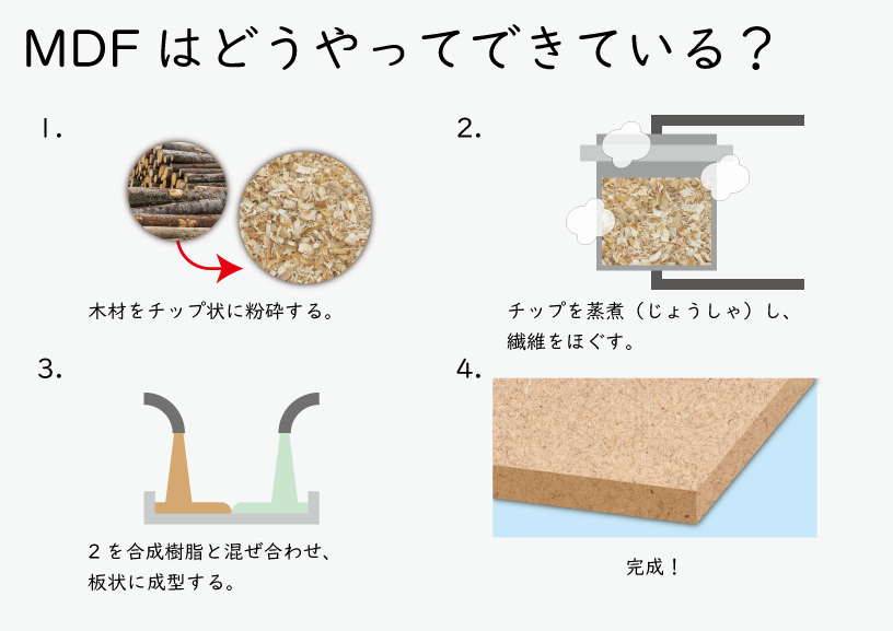 MDF(Medium Density Fiberboard)=中質繊維板(ちゅうしつせんいばん)